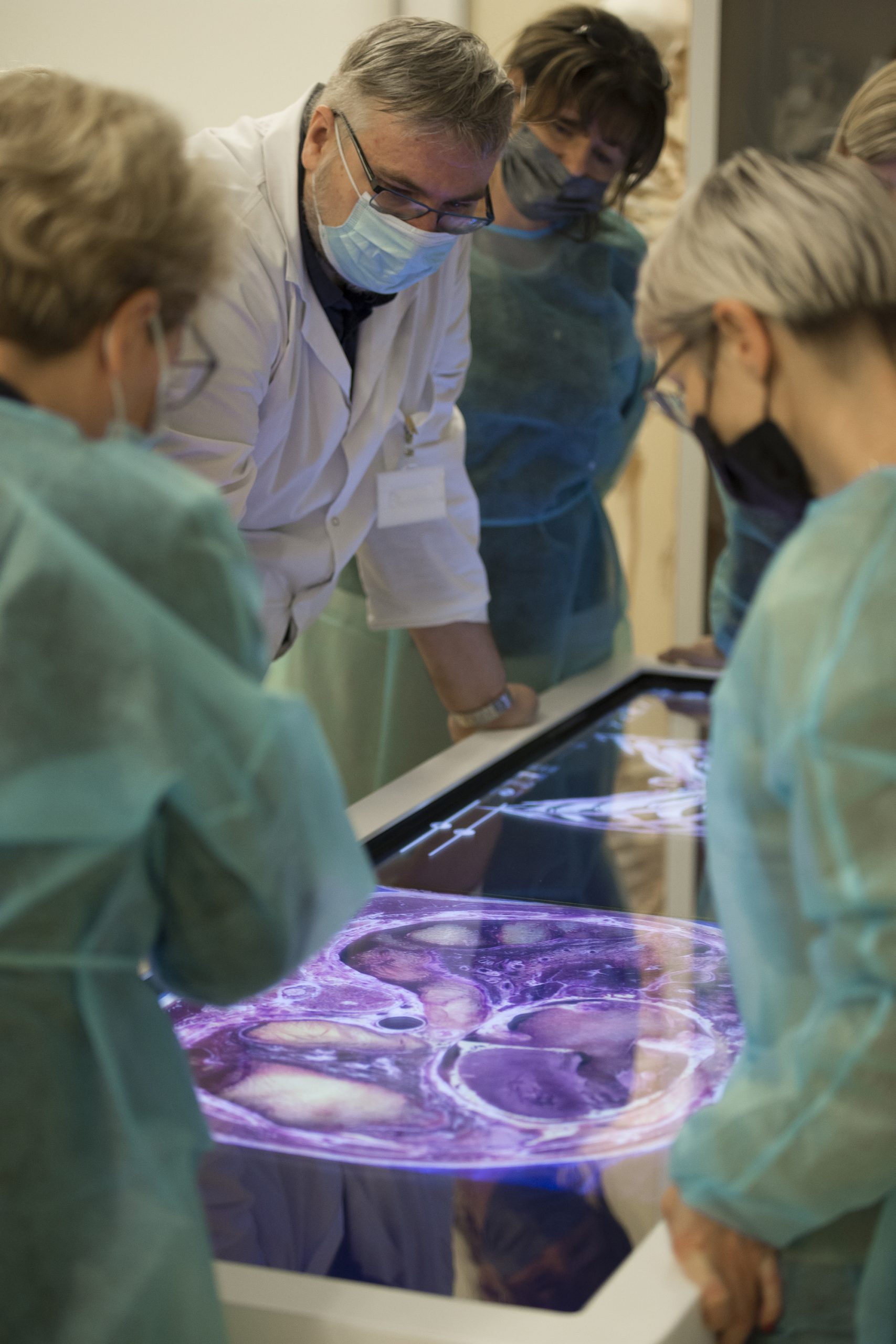 Dr hab. Sławomir Wójcik z Zakładu Anatomii i Neurobiologii, pełniący również funkcję kierownika Działu Rekrutacji GUMed, przygotował dla nauczycieli ciekawe zajęcia warsztatowe w pracowniach anatomicznych. Zaproponował tam pracę z klasycznymi preparatami, zaprezentował też nowe możliwości, jakie daje interaktywny stół anatomiczny wykorzystywany w trakcie zajęć ze studentami. Druga część spotkania, poświęcona ofercie edukacyjnej i procesowi rekrutacji, zawierała wiele informacji przydatnych i nauczycielom, i ich uczniom.